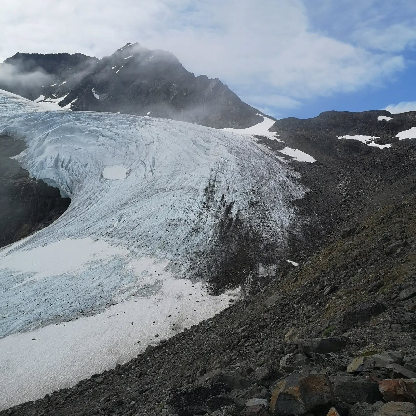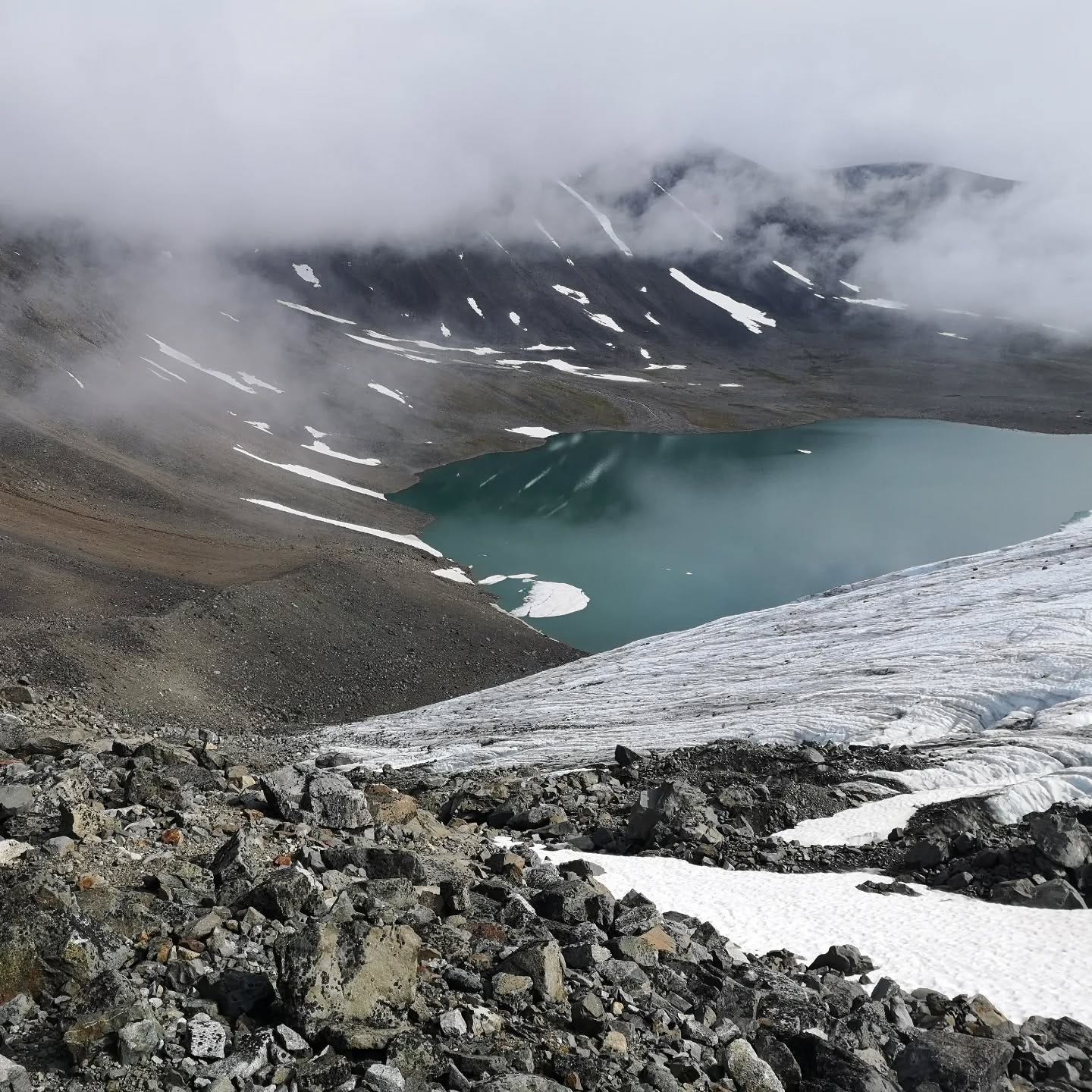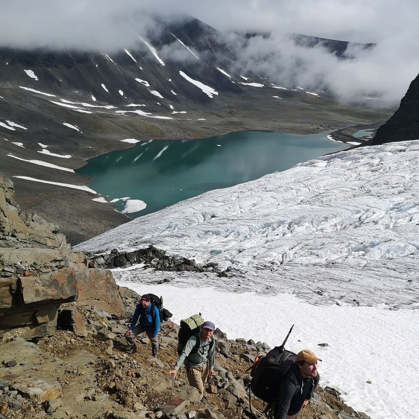 Day 3 of 6. Part one. From Tarfala up another unmarked path over the side moraine of a glacier over lose rocks. The crux to reach the pass was either walking over the side of the Glacier or scrambling around an exposed ledge. We are not equipped or trained for glaciers, so we scramble. This pass can only be crossed with good weather conditions and we got lucky. The views just kept getting better.
